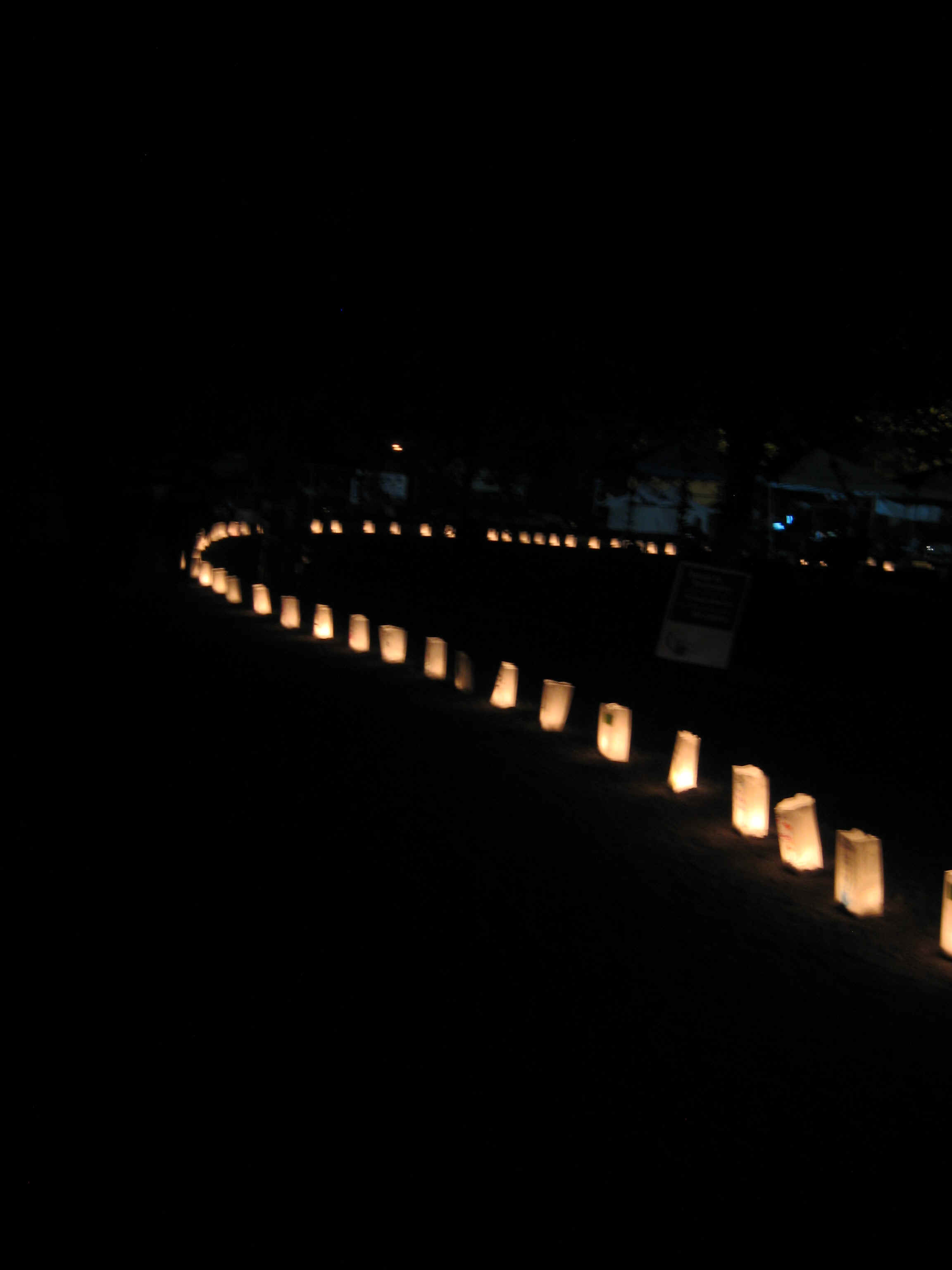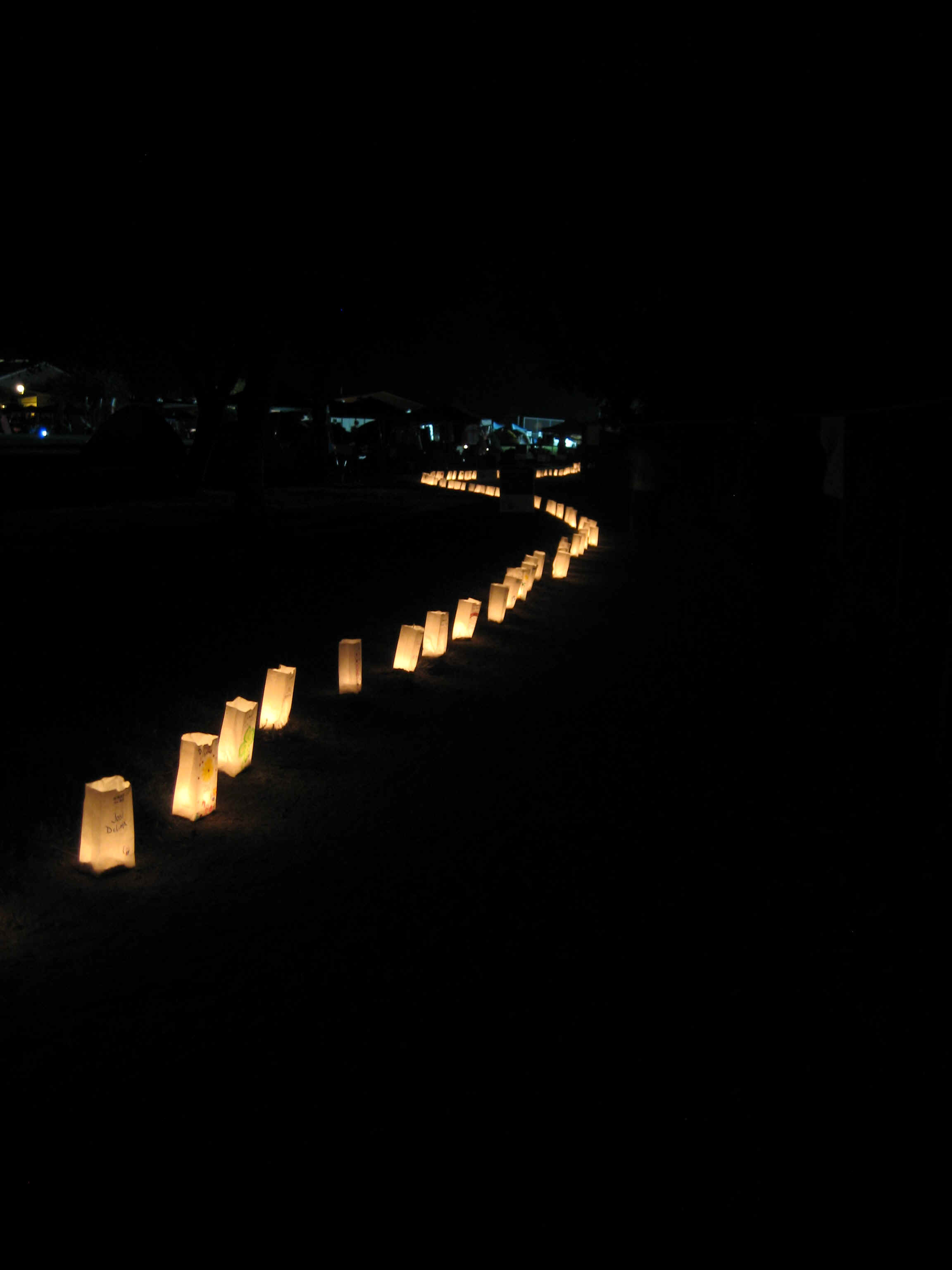 Luminaria are bags lite with candles that burn all night long displaying the names of individuals that have had to fight cancer. |